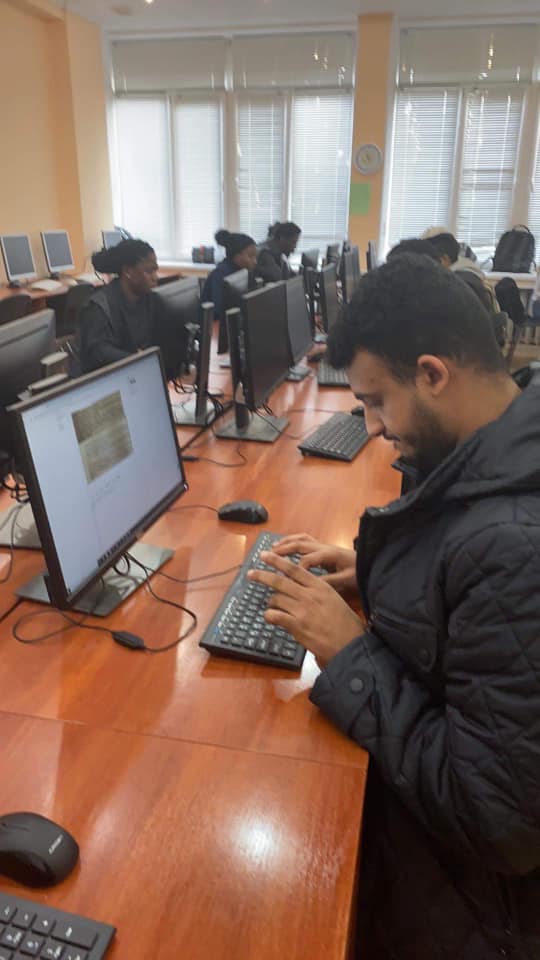 Another group of students has finished learning the language and is passing a final exam on computers.