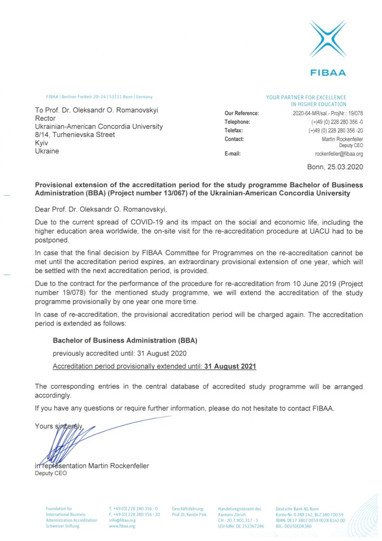 Due to the current epidemiological situation in the world the on-site visit of FIBAA Accreditation Agency, scheduled for April 1-2, 2020 is postponed. Accreditation of Bachelor of Business Administration Program at ConcordiaUA is extended to August 31, 2021.