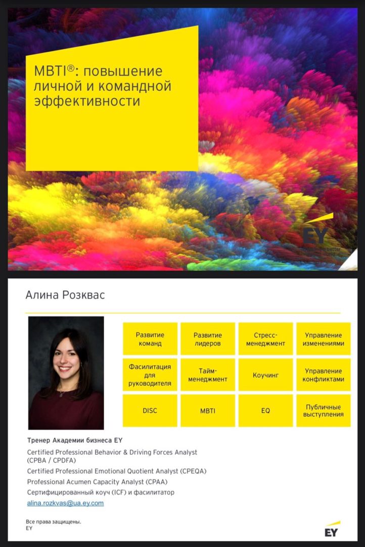 Also for me personally, there was a very interesting module devoted to Human Typology, conducted by Rozkvas Alina, trainer-consultant of EY. We analyzed the personality types of a person, from the features, as well as the necessary understandings for contact with their different representatives.