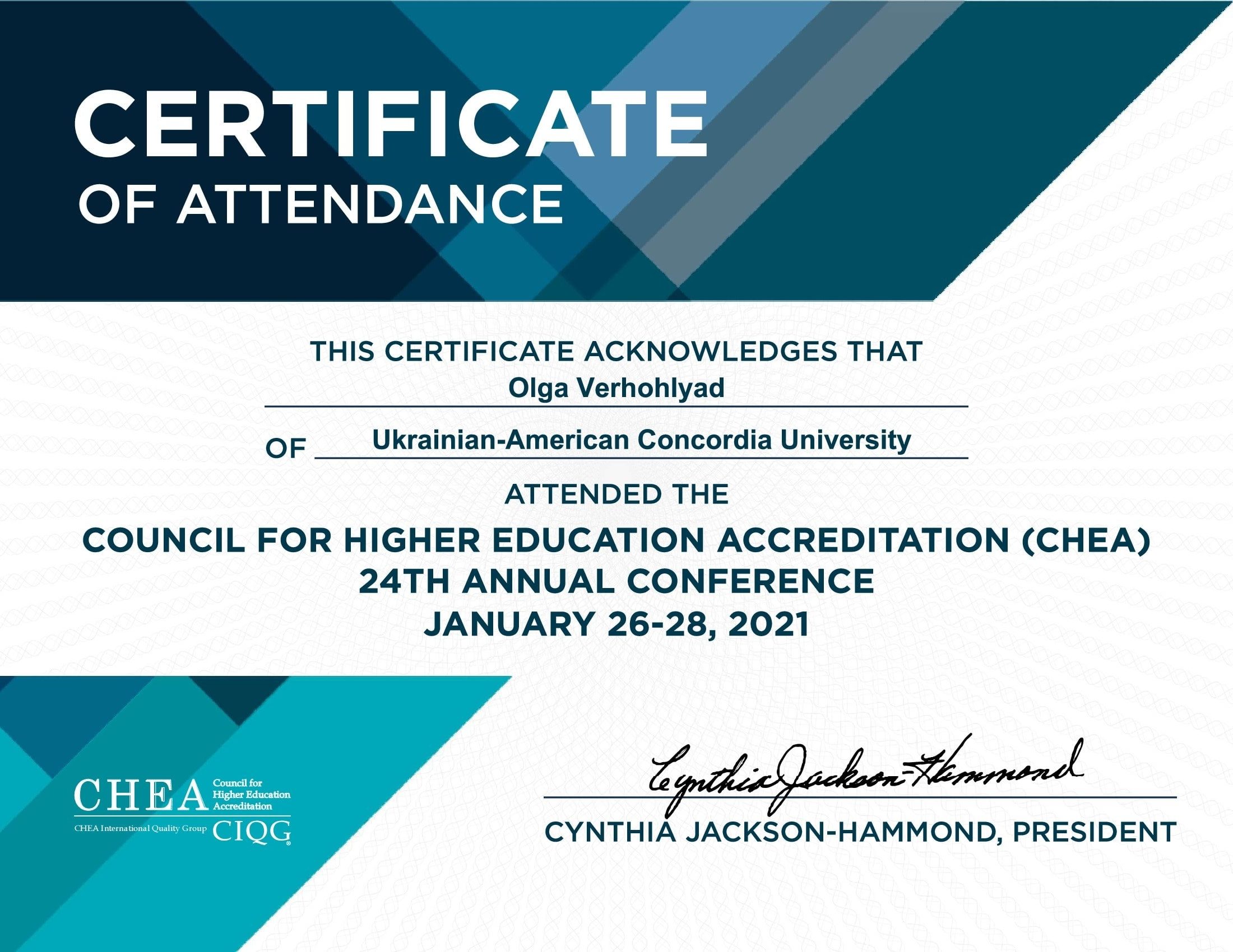 Certificate CHEA – Natalia Protsun