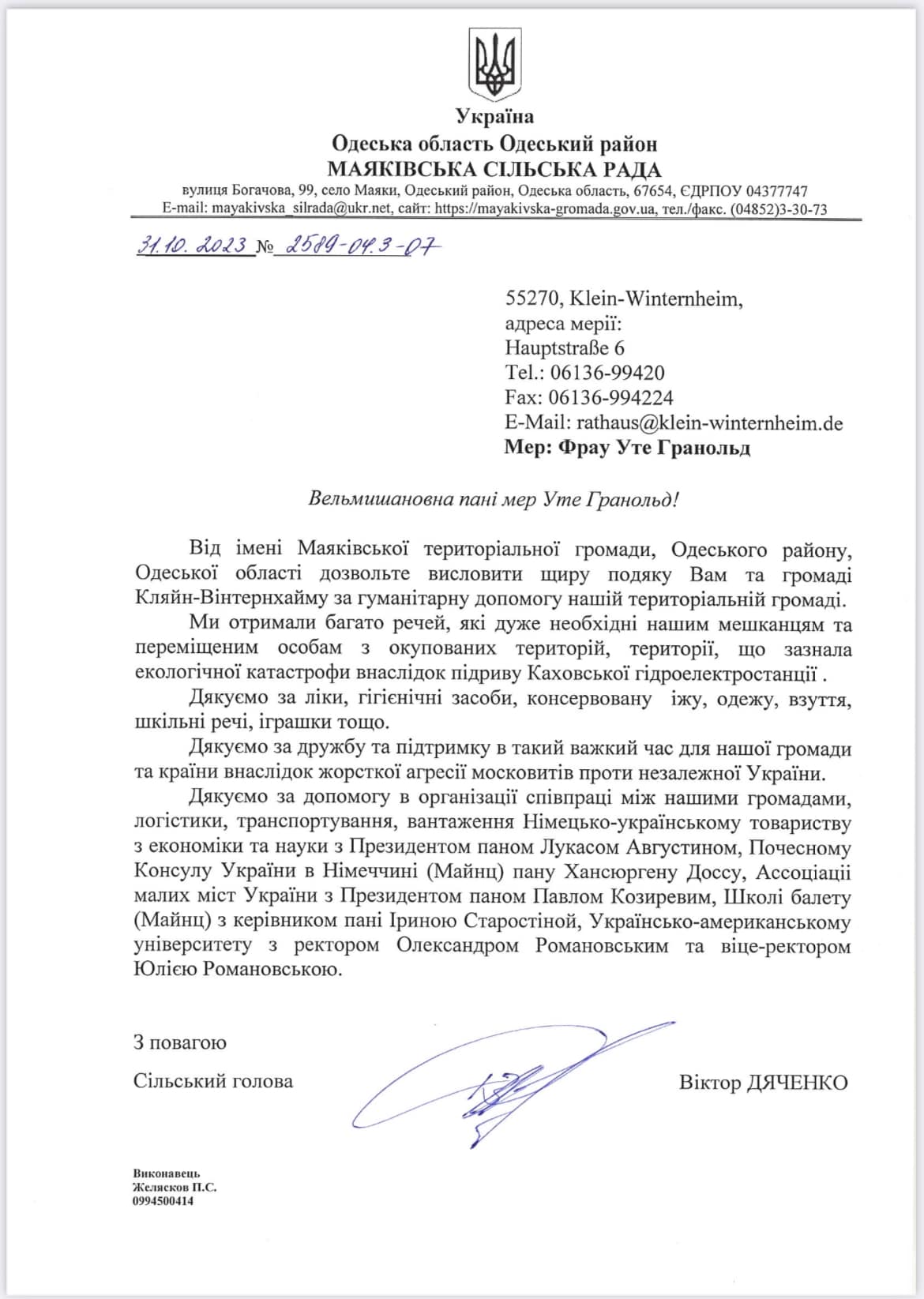 Letter of thanks from the Mayaky Territorial Community to the residents of the Klein-Winterheim