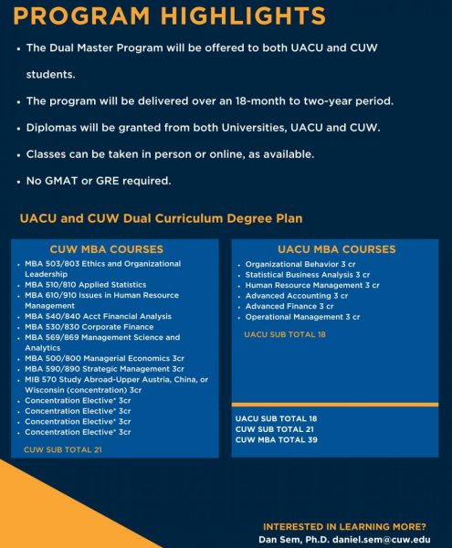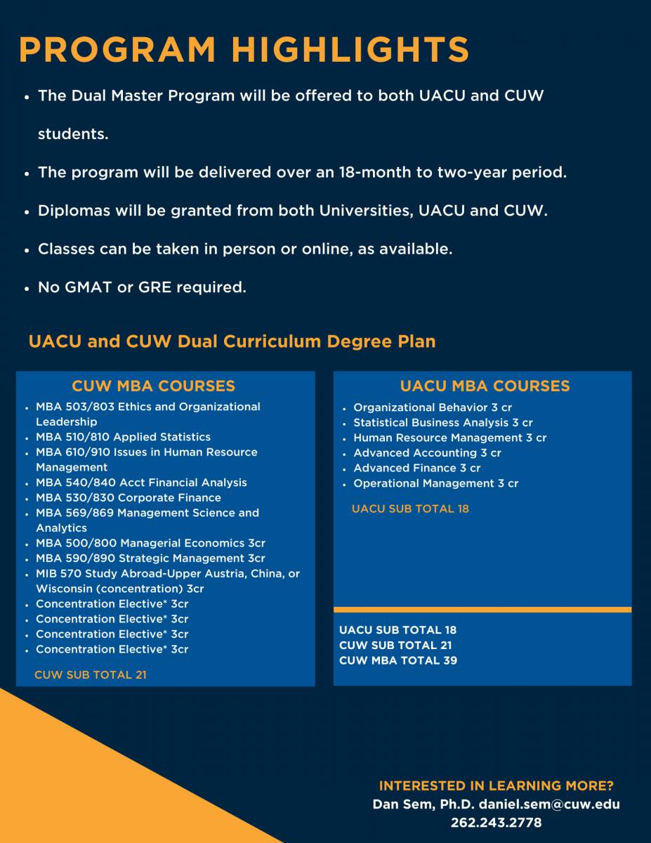 The program will be delivered over an 18-month to two-year period and will place a high emphasis on ethical business instruction. Students who successfully complete the entire curriculum, which includes a required study abroad period at the partner university, will be granted a degree from both CUW and UACU. Classes can be taken in person or online, as available.