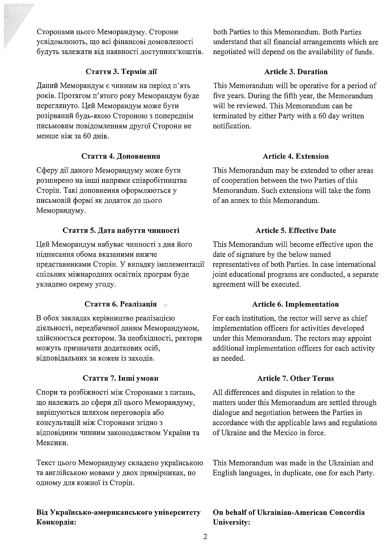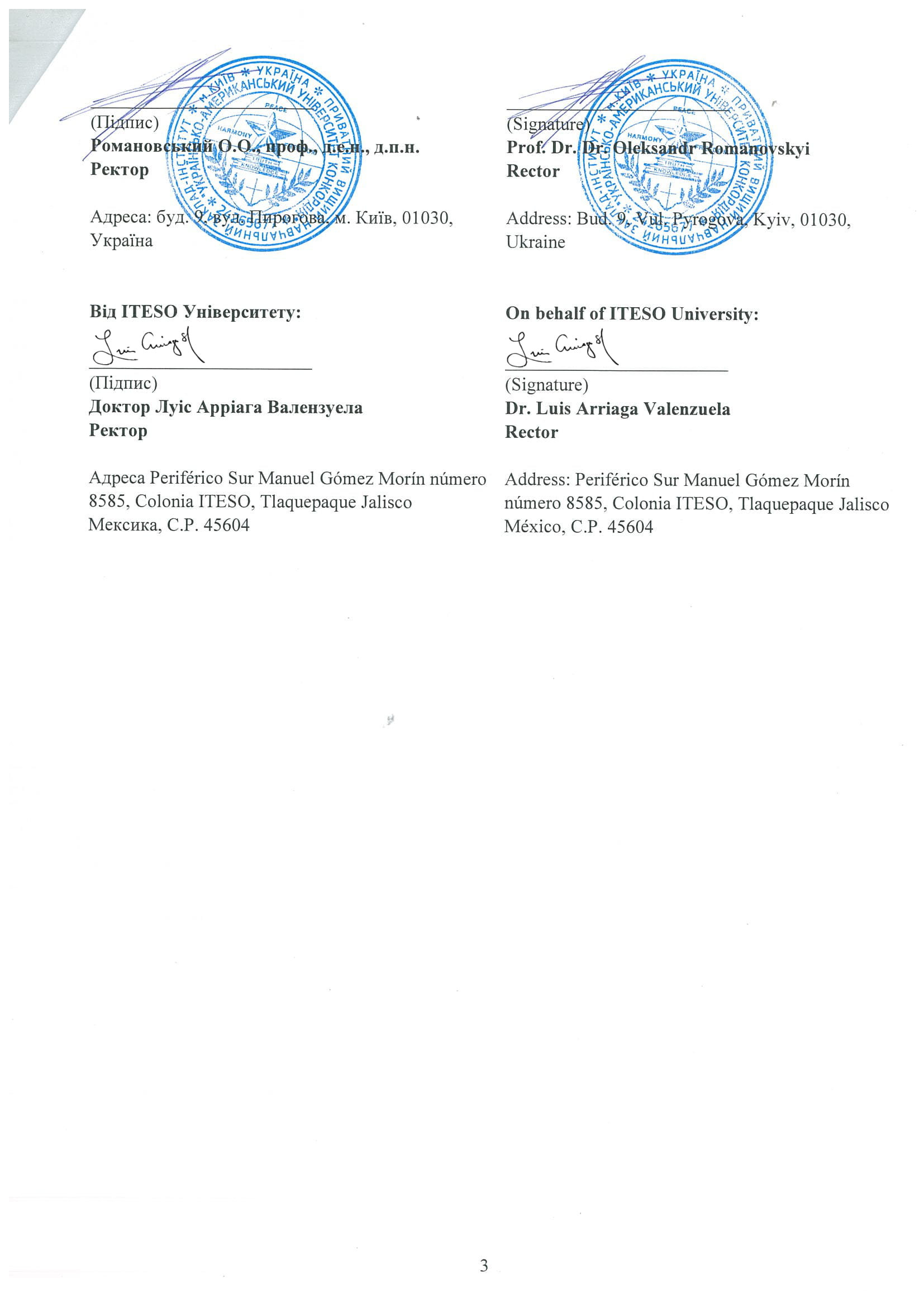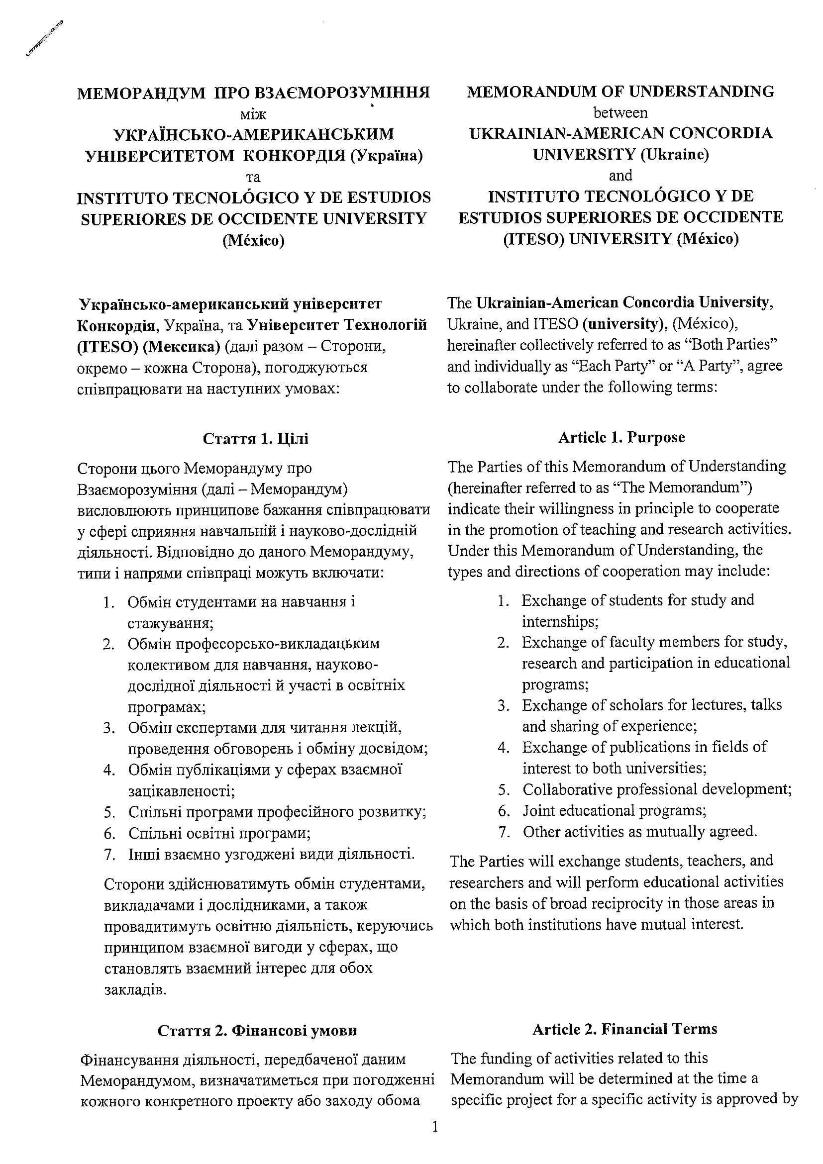 On March 2021 was signed the Memorandum of Understanding between Ukrainian-American Concordia University and Instituto Tecnológico y de Estudios Superiores de Occidente, ITESO (Mexico).