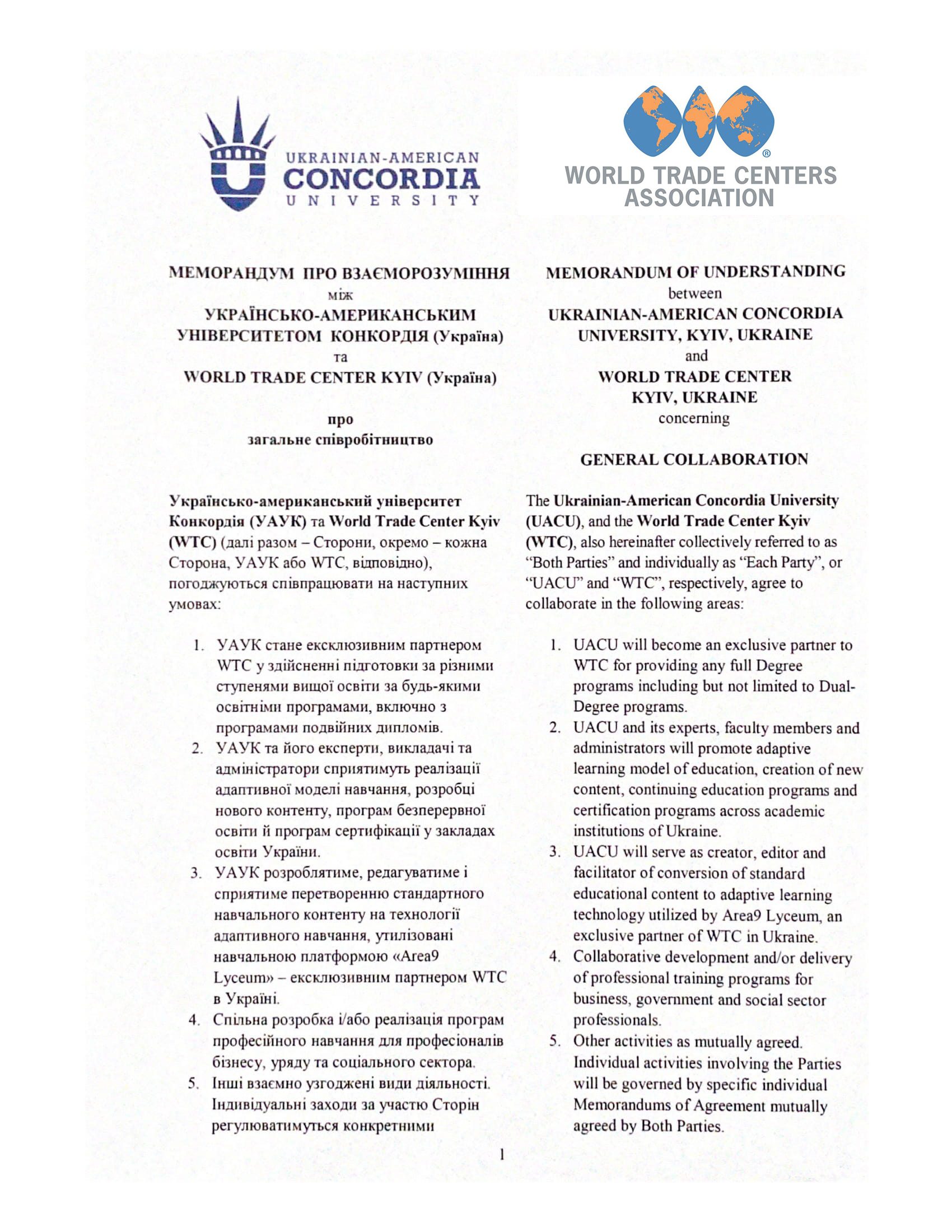Меморандум про взаєморозуміння між Українсько-американським університетом Конкордія (УАУК) та WTC Київ був підписаний у червні 2021 року. Відповідно до цього Меморандуму УАУК є ексклюзивним постачальником освітніх послуг для програм на здобуття ступеня BBA та MBA, програм подвійних дипломів, професійної освіти та програм професійної сертифікації для бізнесу, уряду та соціального сектору.